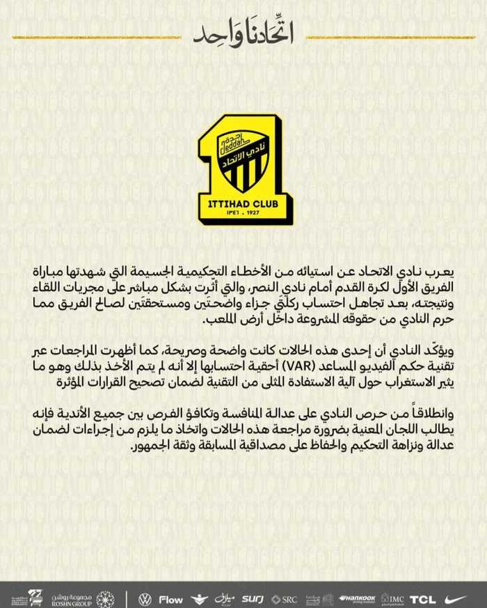 吉达联合俱乐部就一线队对阵利雅得胜利的比赛中出现的重大技术性误判表示强烈抗议。这些判罚直接影响了比赛进程及结果,裁判两次无视有利于我方的应判罚的明显犯规,剥夺了俱乐部在赛场上的合法权益。
